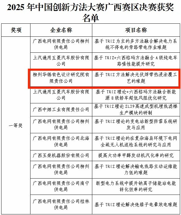 近日,2025年中國創(chuàng)新方法大賽廣西賽區(qū)決賽在南寧圓滿落幕。經(jīng)過激烈角逐,華錫有色設計研究院發(fā)表的《基于TRIZ方法解決光伏焊帶熱浸涂覆工藝的難題》項目榮獲廣西賽區(qū)一等獎。